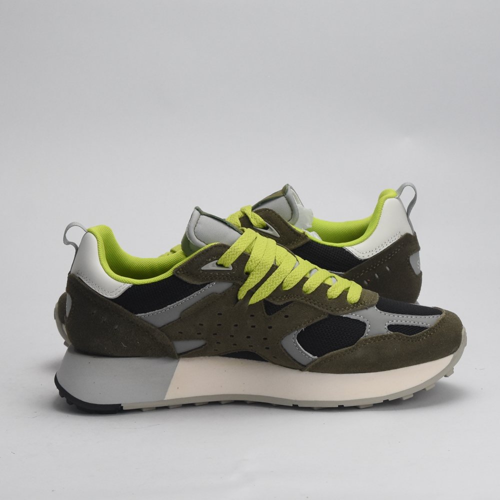 Description : Les Sneakers SUN68 JAKI-OUTDOOR-19-MILITAIRE sont la fusion parfaite entre le style casual emblématique de la marque et une construction robuste inspirée de l’extérieur (Outdoor). Ce modèle est conçu pour l’homme qui recherche une chaussure polyvalente et résistante, sans compromettre le style.Conception et MatériauxModèle : Jaki Outdoor.Saison : Printemps/Été.Couleur : MILI (Vert Militaire).Tige (Empeigne) : Elle est principalement composée de cuir suédé (daim) de qualité, rehaussé d’empiècements en mesh respirant pour un confort accru.Semelle : La semelle extérieure en caoutchouc est renforcée et dotée d’une bande de roulement (battistrada) géométrique, offrant une adhérence supérieure, idéale pour les surfaces variées.Style et FinitionsFermeture : Lacets classiques sur l’avant.Détails Iconiques : La chaussure arbore le logo emblématique de la marque (le triangle et la croix) dans une couleur contrastée.Marquage : Le lettrage ‘SUN68’ est visible sur le talon.Coupe : Coupe classique (Regular Fit). Made In China .