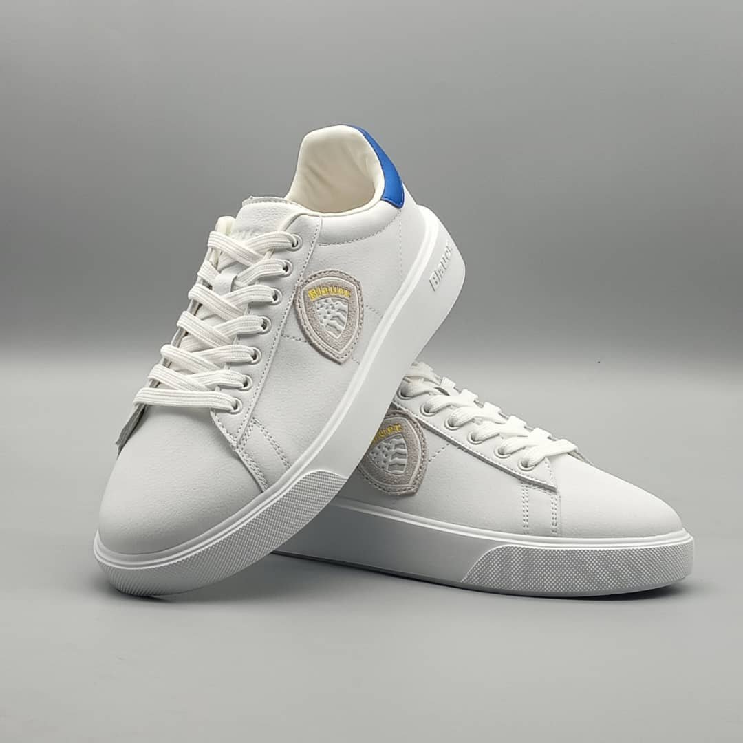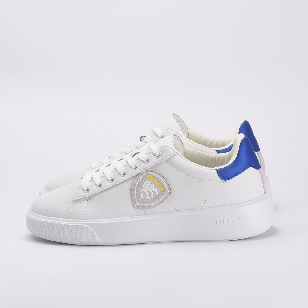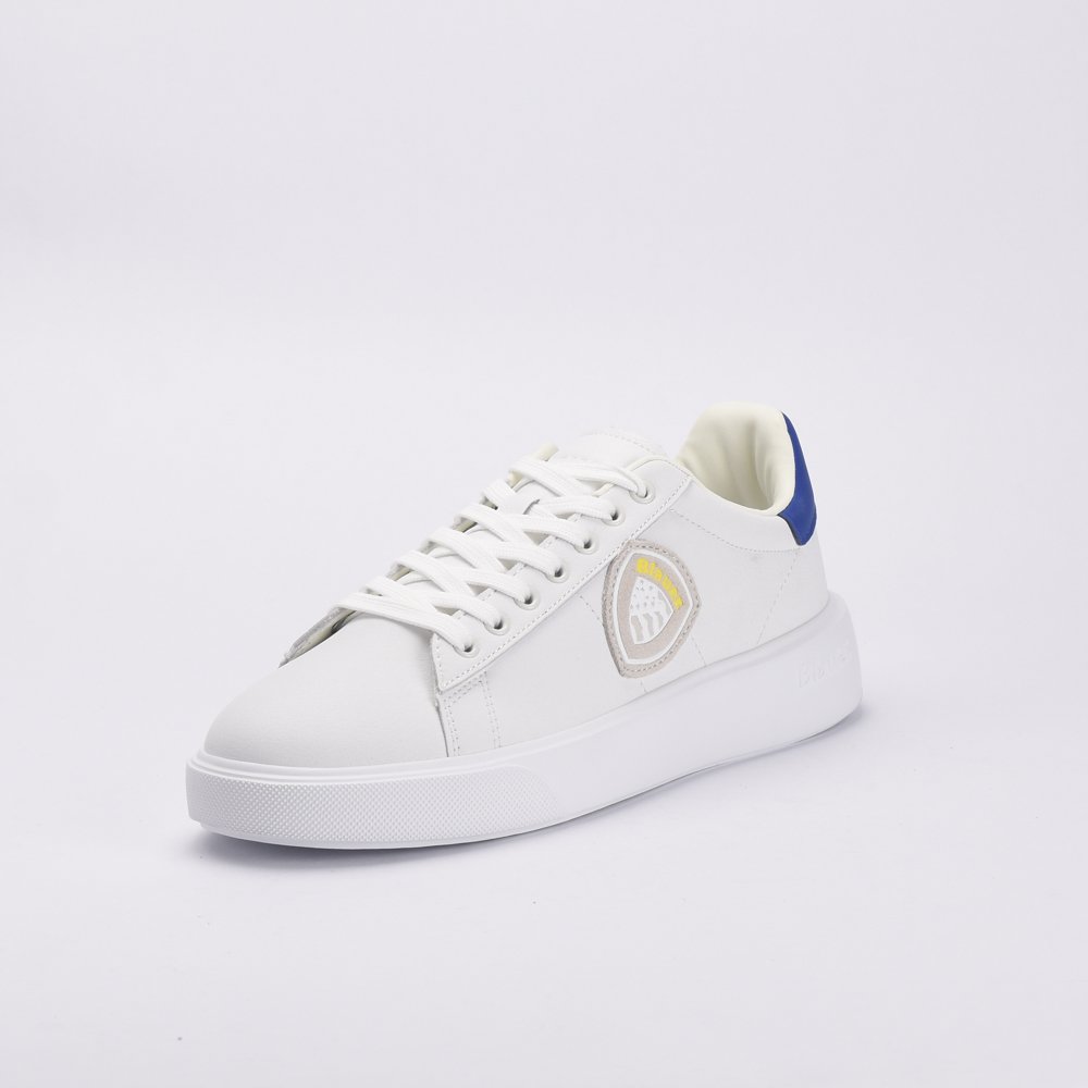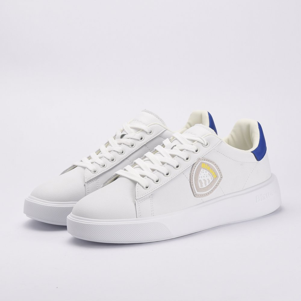 Baskets homme blanches avec logo patch contrastant en gris clair, blanc et jaune. Empiècement contrastant bleu au talon. Semelle de 3,5 cm. Tige en cuir et cuir synthétique, intérieur en tissu et cuir synthétique, semelle en caoutchouc.DESIGNED IN USAUSA BRANDMADE IN CHINA