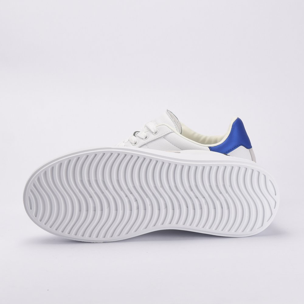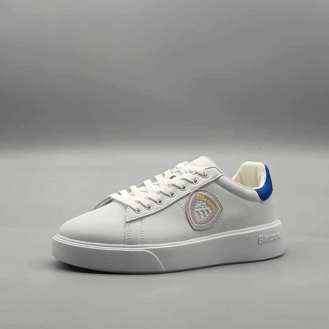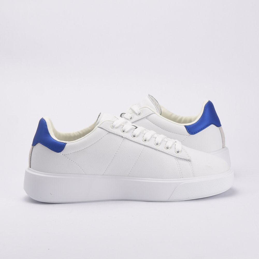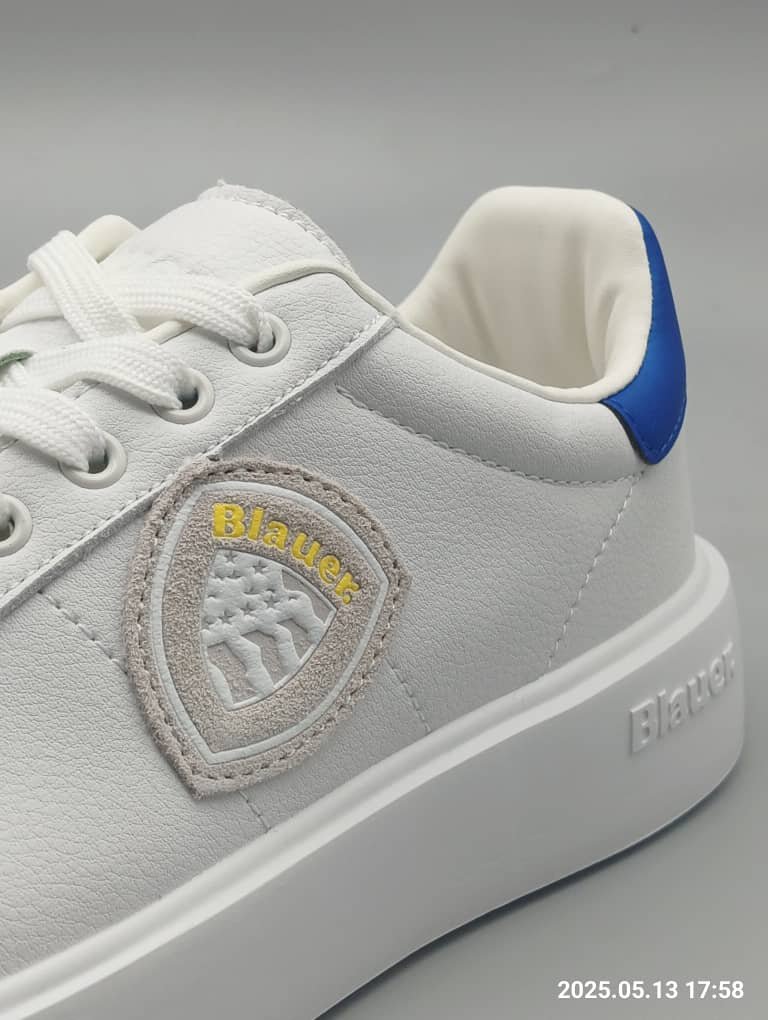 Baskets homme blanches avec logo patch contrastant en gris clair, blanc et jaune. Empiècement contrastant bleu au talon. Semelle de 3,5 cm. Tige en cuir et cuir synthétique, intérieur en tissu et cuir synthétique, semelle en caoutchouc.DESIGNED IN USAUSA BRANDMADE IN CHINA